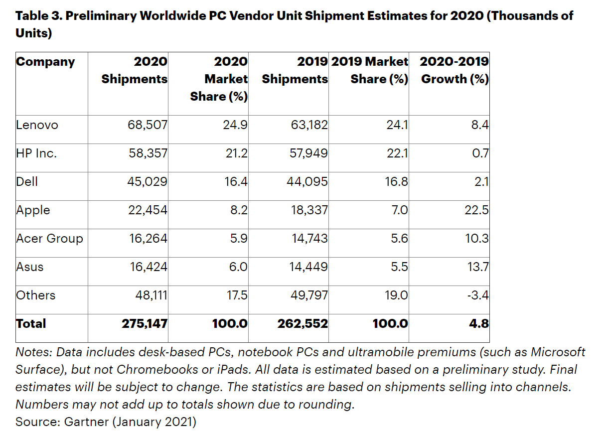 榮耀即將發佈多款PC新品的背後,是全球PC市場正在迎來里程碑的一年。根據Gartner數據指出,在全球市場,2020年全年PC出貨量達到2.75 億台,同比增長4.8%,創下了十年來的最高增長。