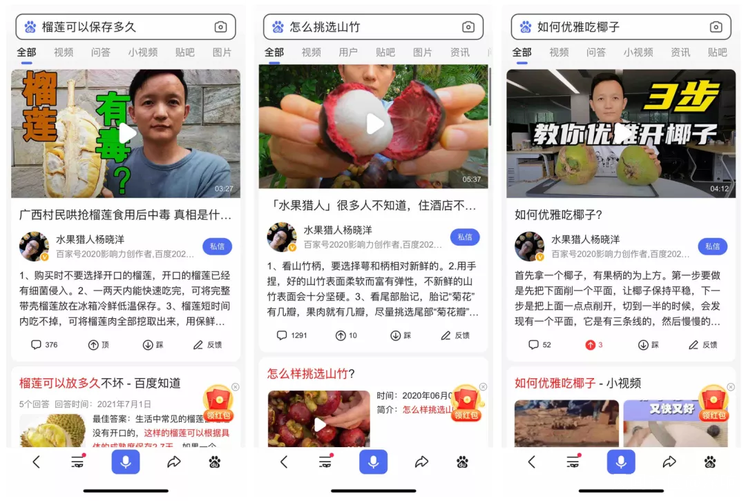 百家號創作者“水果獵人楊曉洋”就受益於這一計劃。當打開百度APP搜索“怎麼挑選山竹”、“如何優雅吃椰子”、“榴蓮可以保存多久”等與水果相關的問題時,搜索頁的第一條總會出現他的視頻。視頻中,楊曉洋會將水果的產地、特性、品種、口味等問題一一講解清楚。可以説,在大多數用户心中,楊曉洋就是“最懂水果的那個男人”。