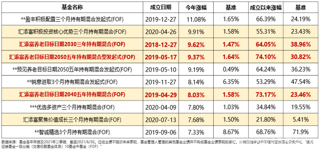 基金中期報告顯示,匯添富養老2030混合(FOF),自2018年12月27日成立以來,累計回報64.05%,同期業績比較基準收益為38.96%。(注: 招募説明書顯示,匯添富養老2030混合自成立至2021年的權益類資產配置目標比例是57%。業績數據取自基金2021年中期報告,數據截至2021.6.30)