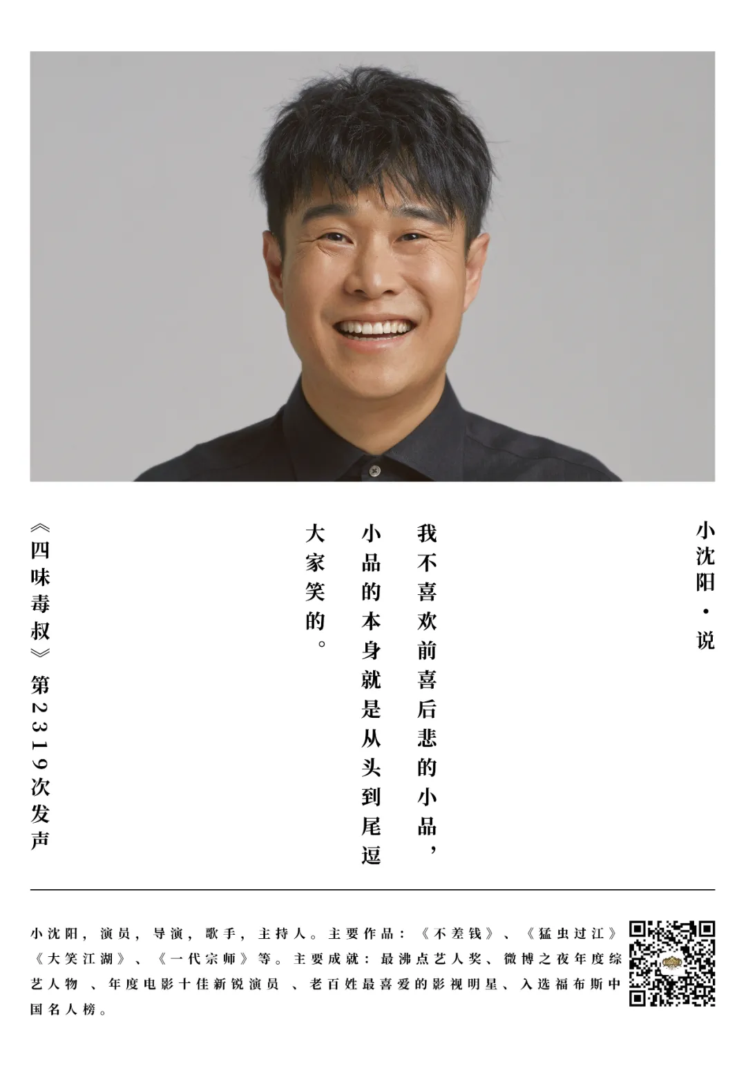 **小瀋陽:**大家對我這句話的意思可能有些誤會,我的説法是,沒有好的小品我是不會再演了,但如果有好的小品出現,我還是會演的。因為我是演小品出身的,我特別知道小品的重要性,同時也特別享受小品給大家帶來快樂的那種感覺。作為一個演員來講,他在台上短短的20多分鐘、15分鐘、10分鐘,能夠把大家逗得那麼開心是一件很爽的事情。