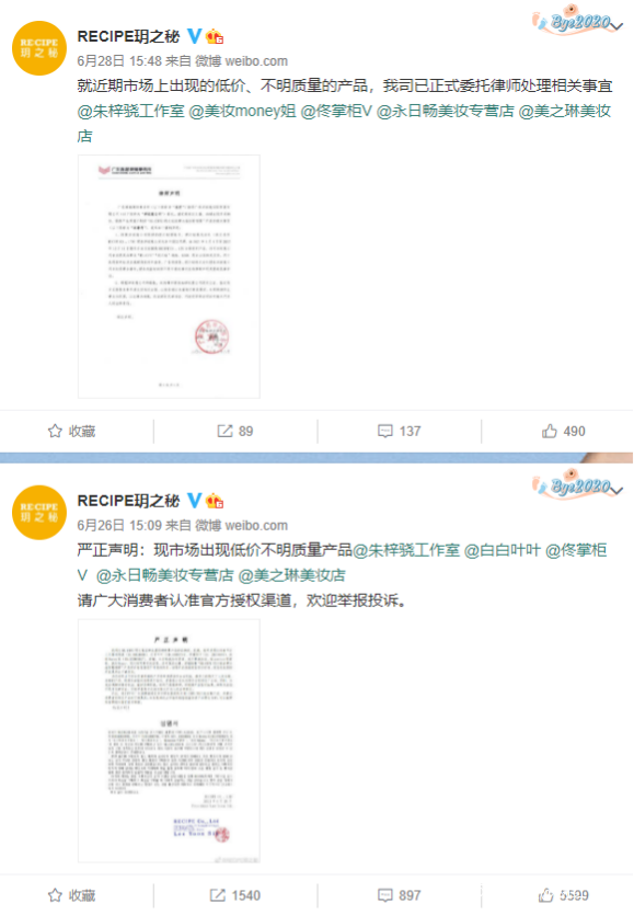 記者發現,朱梓驍直播間內的低價產品,也引起了許多品牌商的注意。例如,在2021年6月,韓國品牌“RECIPE玥之秘”就在其官方微博上表示,在朱梓驍直播間內,該品牌產品的價格,顯著低於市場採購價,為“低價、不明質量的產品”,並提醒消費者認準官方渠道。