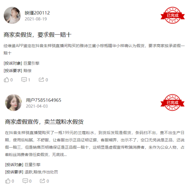 記者隨即在黑貓投訴上發現,最早在2021年4月3日,就已經有針對朱梓驍直播間的投訴。該投訴人稱,其在朱梓驍直播間花費199元購置的蘭蔻粉水(商品名為蘭蔻清瀅柔膚爽膚水),客服無法提供正品證明,膚感也與正品有差異。