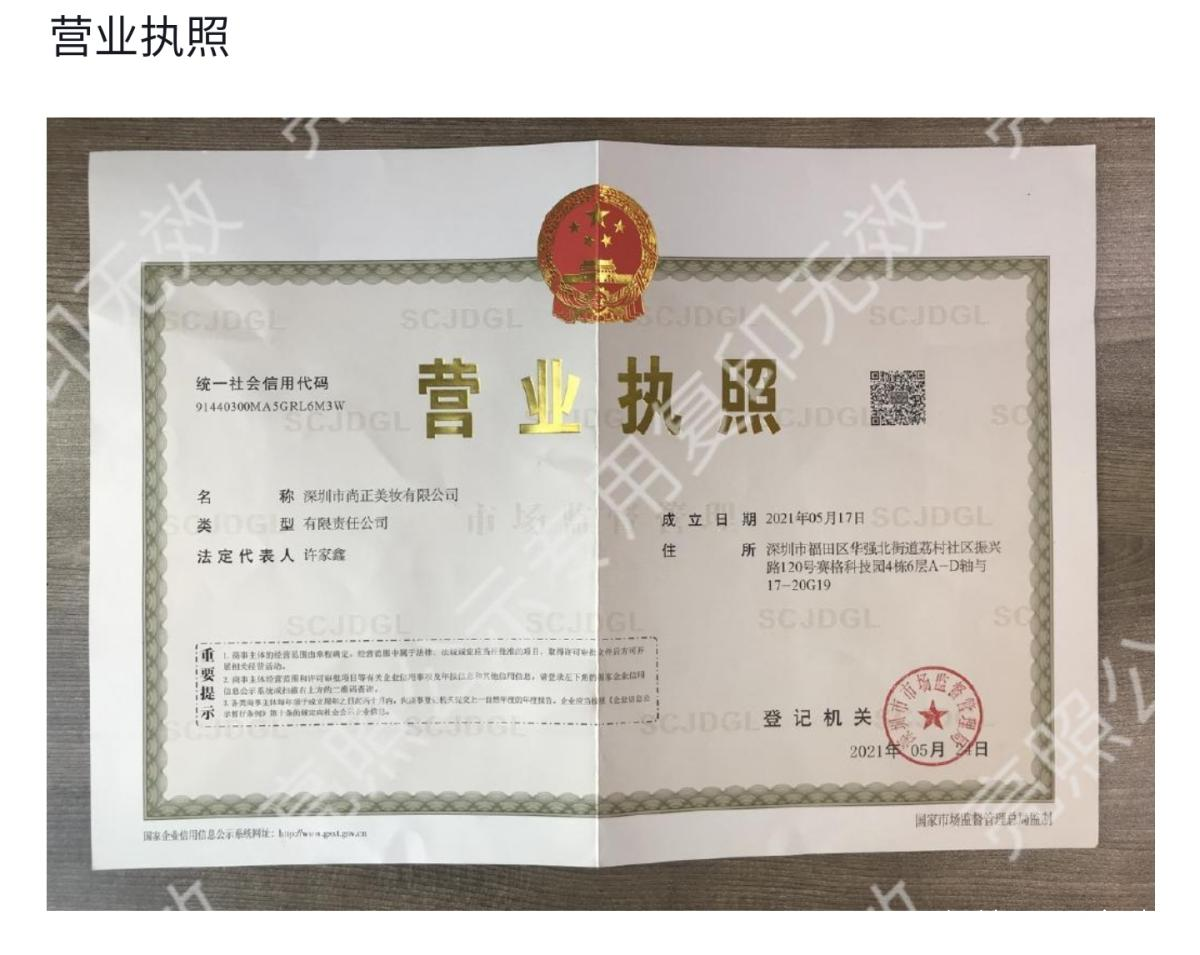 而這款產品的來源,是一家抖音名為“尚正美妝”的店鋪。記者查詢該店鋪營業執照後發現,其經營主體為“深圳市尚正美妝有限公司”,登記住所正是位於華強北的一處科技園。