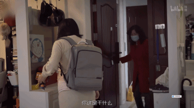 等老人送孩子去幼兒園回來,她已經穿好孕婦裝備準備出門: