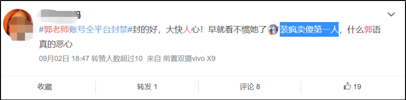 郭老師被封殺後,很多人説封得好,説她是第一個通過扮醜和做出格之舉賺得盆滿缽滿的人,或者説她是裝瘋賣傻第一人。