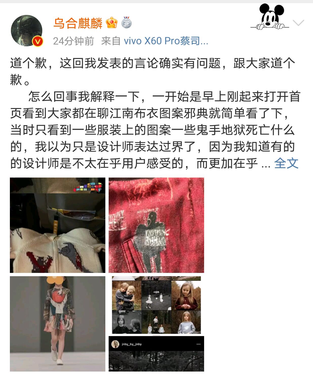 怎麼回事我解釋一下,一開始是早上剛起來打開首頁看到大家都在聊江南布衣圖案邪典就簡單看了下,當時只看到一些服裝上的圖案一些鬼手地獄死亡什麼的,我以為只是設計師表達過界了,因為我知道有的的設計師是不太在乎用户感受的,而更加在乎自己藝術理念的表達,他們設計東西根本不在乎市場接受不接受,而是當做一種自己的作品來設計,當然我個人是非常不認同這種設計理念的,所以我發了前一條微博,主要是表達説,設計師在某些時候應該放下自己考慮考慮用户體驗,特別是在涉及兒童設計的時候更不能夾雜主觀,這個其實是我上一條微博的核心思想。