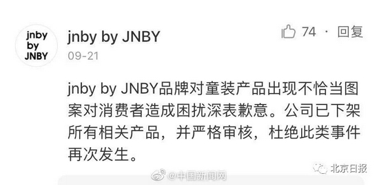 消息發出後,江南布衣集團旗下童裝品牌官方賬號“jnby by JNBY”立刻回覆,稱相關的產品已經下架,公司也開始審查相關產品,杜絕類似事件再度出現。