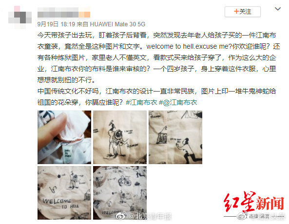 9月19日晚上,有網友在社交平台上發文,稱家裏老人為孩子購買的江南布衣旗下的童裝襯衣上,有大量不恰當,且詭異的圖案。