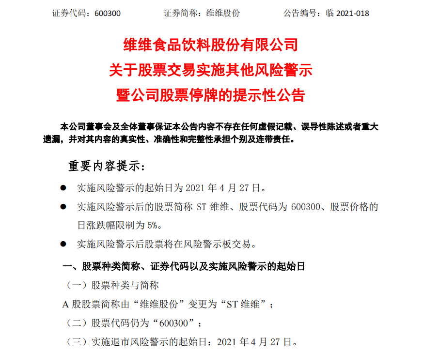 更打擊人的事還在後頭。2020年年度報告剛發出來兩天,維維就被實施風險警示,維維股份就變成了“ST維維”。