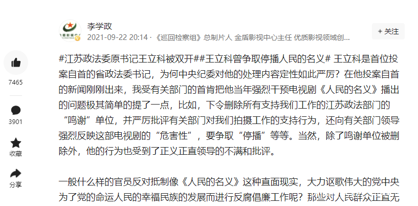 9月22日,《人民的名義》總監製李學政發文稱江蘇政法委原書記王立科曾想讓該劇停播,王****立科還曾下令刪除所有涉及江蘇政法部門的“鳴謝”單位,嚴厲批評有關部門對拍攝工作的支持,強烈反映該劇的“危害性”。