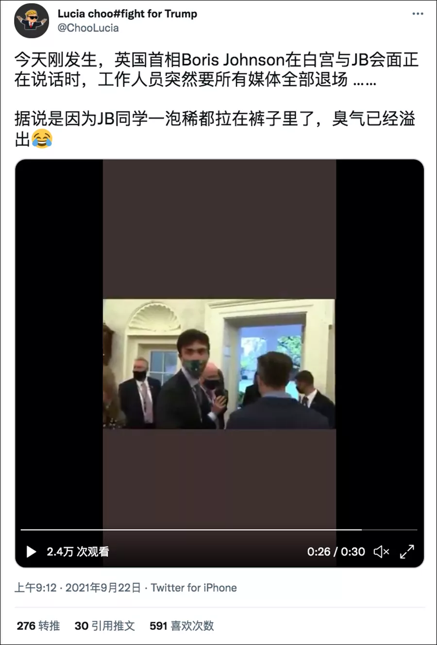 其實,消息的源頭也是來自美國。美國內容機構Breaking911在北京時間9月22日5點45分發布了一段視頻,配文稱:“幾分鐘前,工作人員打斷英國首相鮑里斯·約翰遜的話,命令新聞媒體離開白宮。”6分鐘後,有288個粉絲的推特用户@Badinfinitum在北京時間9月22日5點51分點評了這段視頻,稱拜登大便失禁。