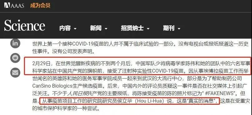 直到去年12月上旬,著名的《科學》雜誌高級編輯JonCohen在一篇名為《中國疫苗策略》的回顧文章中明確指出:2月29日,中國軍隊少將軍銜的病毒學家陳薇和她團隊的六名科學家一起,在黨旗下接種了試驗性的COVID-19疫苗。