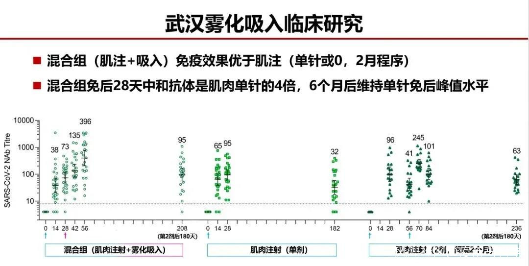克威莎【第1劑肌肉+第2劑吸入】的混合接種效果,優於單純的肌肉接種。免疫後28天的中和抗體水平是單針肌肉接種抗體水平的4倍(也優於肌肉接種2劑,間隔2個月),且6個月後抗體水平仍維持在單針免疫後峯值水平。