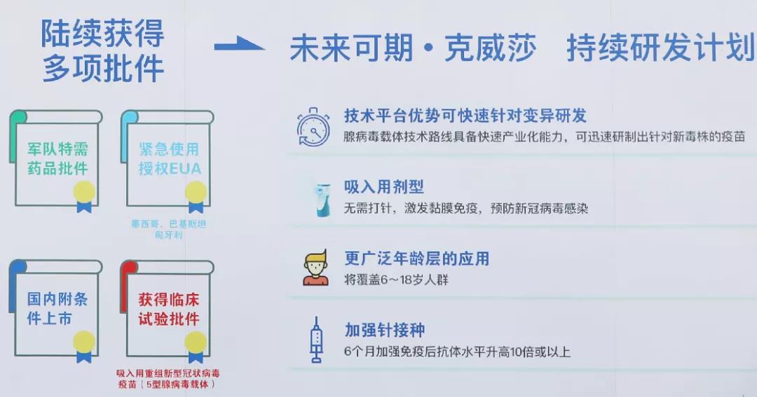 康希諾生物與軍科院陳薇院士團隊合作的COVID-19腺病毒載體疫苗,是全球最早打上人體的COVID-19疫苗,商品名:克威莎。