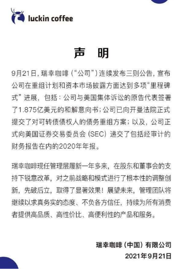 9月21日晚,瑞幸咖啡發佈聲明稱,公司今日發佈三則公告,宣佈公司在重組計劃和資本市場披露方面達到多項“里程碑式”進展,包括:公司與美國集體訴訟的原告代表簽署了1.875億美元的和解意向書;公司已向開曼法院正式提交了對可轉債債權人的債務重組方案;公司正式向美國證券交易委員會(SEC)遞交了包括經審計的財務報告在內的2020年年報。