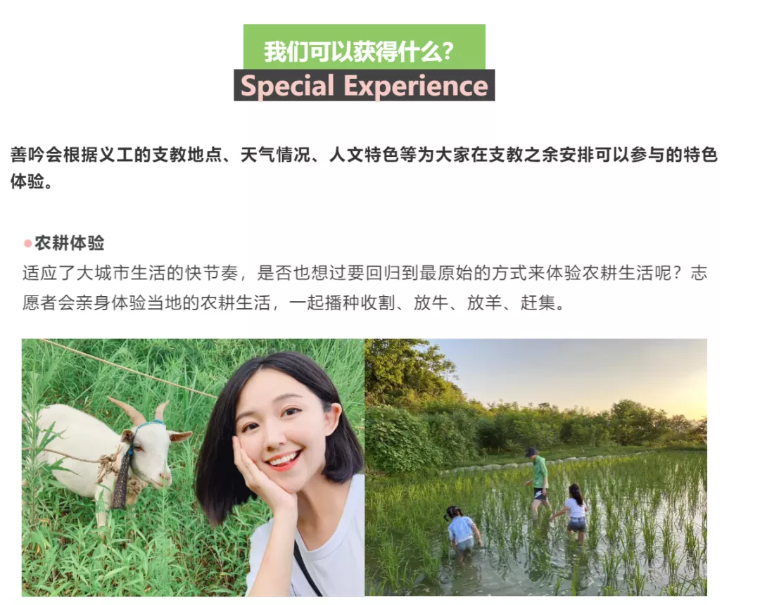 她參與過很多支教公益活動,比如發起“一美元愛心計劃”,為鄉村學生募捐;創辦了一個叫善吟共益的非盈利組織;畢業後全職從事支教服務。