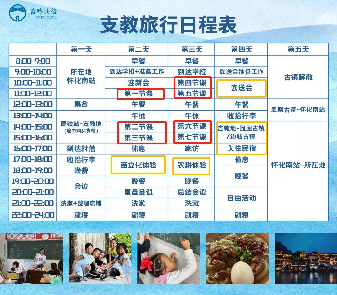 下面是它們的一份行程安排表,支教算下來共計5天時間,而正兒八經在課堂上的時間也就7個小時左右。