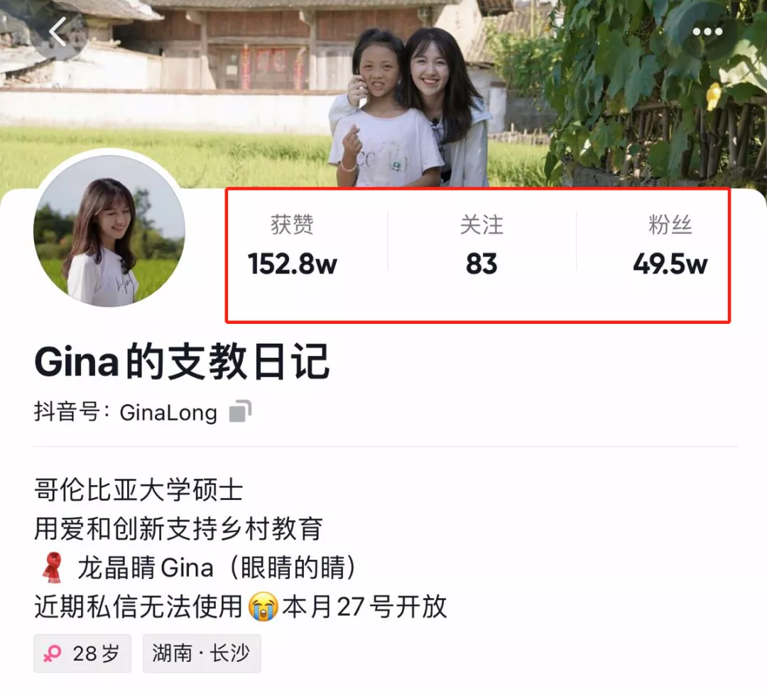 龍晶睛為了更好宣傳自己的支教事業,在抖音上面創建了一個叫@Gina的支教日記的抖音賬號。