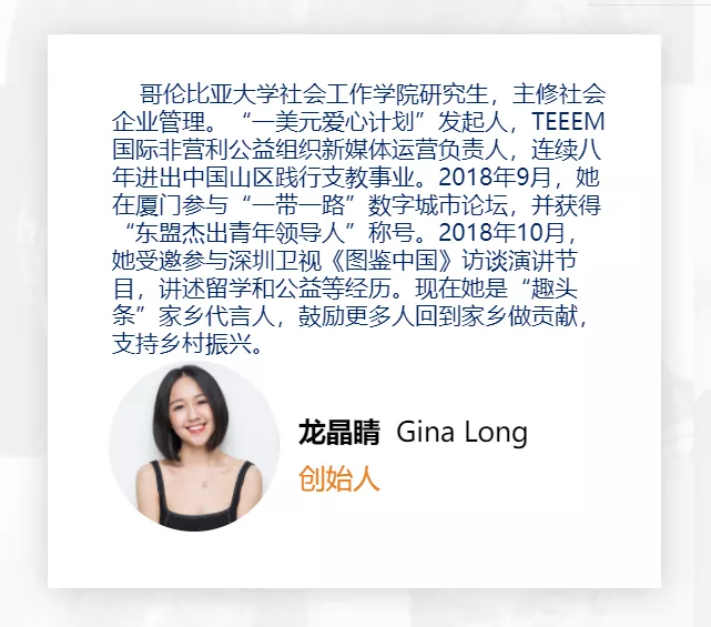 2018年,龍晶睛創辦了善吟共益,它是一家專注於支教服務的公益組織。