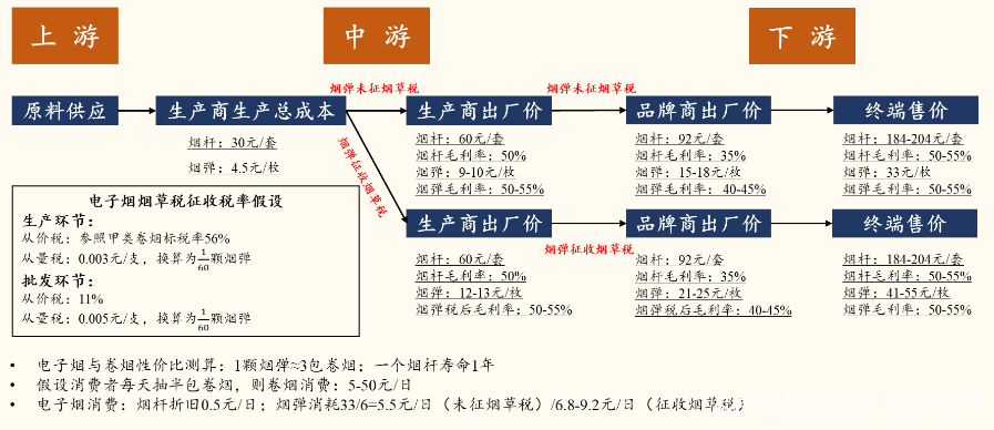 而隨着“電子煙參照捲煙監管”,按照推演拉開電子煙產業鏈的價值分佈及後續徵税的影響測算,從生產商出廠到終端的銷售,煙桿與煙彈的成本將會提高。