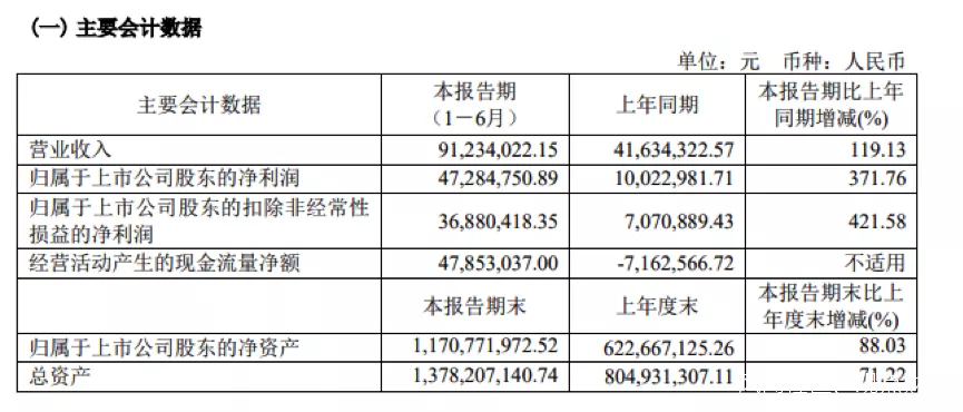 半年報顯示,營業收入為9123萬元,同比增長119.13%;
