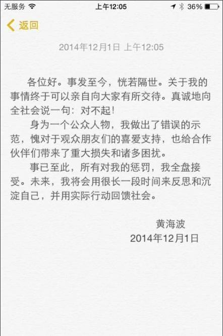 隨後在2014年12月1日,黃海波寫信向公眾致歉,隨後便逐漸淡出公眾視線。