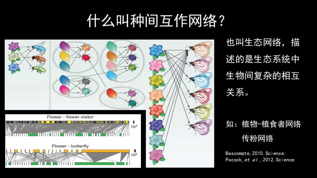 種間互作網絡也叫生態網絡,描述的是森林生態系統中,生物間複雜的相互關係。通俗來説,當走進一片森林,如果我們細心觀測,就會發現同一片植物葉片上面,存在着多種甲蟲,而多種甲蟲,又以不同的植物葉片為食,它們之間就構成了一種複雜的相互關係,這種複雜的相互關係就是一種植物-甲蟲網絡,也叫植物-植食者網絡。又如在一片草地,如果我們細心觀測就會發現,不同的蝴蝶、蜜蜂訪問不同的開花植物,它們之間就構建了一種傳粉網絡。