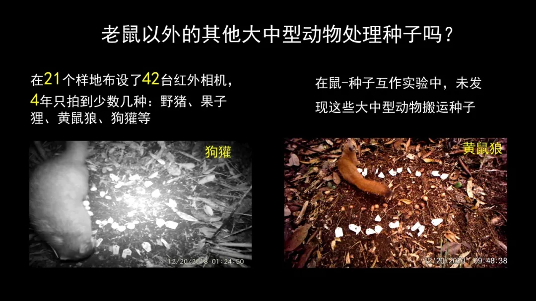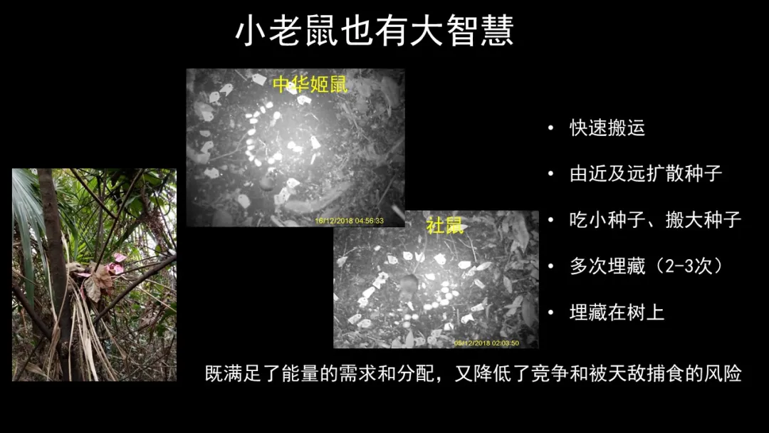 有趣的是在我們研究鼠-種子互作網絡過程中,我們也發現老鼠為了儘快佔有種子,它們會在原地撿吃少數種子,而將大量的種子快速搬走,並且它們會就近分散埋藏種子,然後再慢慢向外面擴散。為了防止被捕食,鼠類會在釋放點僅吃少量小的種子,而將大的種子搬走。而為了防止埋藏的種子被盜走,鼠類多次反覆埋藏,平均達到2~3次,有些甚至達到5次以上,更有甚者被鼠類搬運到樹上埋藏。這也體現了小老鼠具有大智慧,既滿足了能量的需求和分配,又降低了競爭和被天敵捕食的風險。除了鼠類的這種主動行為,我們也在猜想或許老鼠的這種抉擇,也幫助了母樹選擇了更優質的基因傳承。
