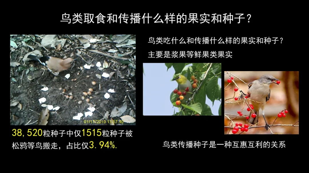 那麼除了老鼠以外,我們也發現了幾種鳥類,像這種松鴉,還有灰翅噪鶥,也對種子起到了一定的擴散作用。然而在我們釋放的38,000多粒種子中,也僅發現了1515粒種子被鳥搬走,佔比也不到4%。那麼大家可能會問,鳥類吃什麼和傳播什麼樣的果實和種子呢?原來大多數鳥類生活在樹上,它們主要取食漿果等鮮果類果實,鳥類吞食了果實後,一般會吃掉果肉,而將種子通過消化道排出體外,因為排出的種子攜帶了鳥類糞便,這也有利於種子的萌發,因此鳥類傳播種子,也是一種互惠互利的關係。