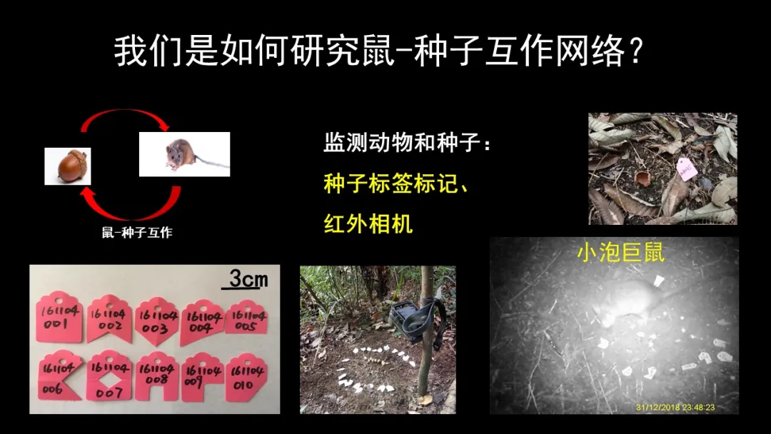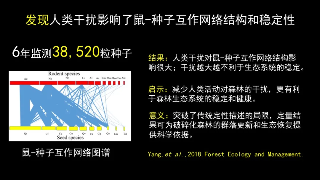 ,時長00:15我們也採用種子標籤和紅外相機技術相結合,我們在都江堰十四個斑塊,連續六年,監測了38,520粒枹櫟、栓皮櫟等十種植物種子。我們的研究目的,是為了探究人類干擾導致的森林破碎化,對鼠-種子互作網絡結構和穩定性的影響。我們也發現了,人類干擾確實對鼠-種子互作網絡結構影響很大,並且發現干擾越大,越不利於生態系統的穩定。