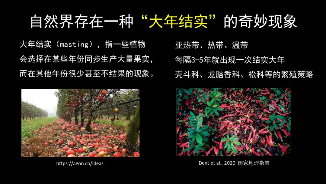 **“大年結實"指一些植物會選擇在某些年份,同步生產大量的果實和種子,而在其它年份很少生產和不結果的一種現象。**猶如農民種植的果樹一樣,如果今年大量結果 可能明年結果就很少了。這種現象不僅發生在亞熱帶森林中,而且在熱帶和温帶森林也時有發生,森林中的很多植物,每隔3~5年就會出現一次大年結實。大年結實也是殼鬥科、龍腦香科、松科等很多植物繁殖的一種策略。