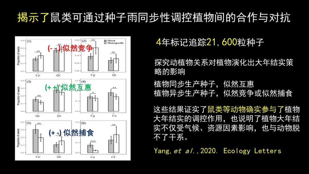 我們的這些結果也證實了,鼠類等動物確實參與了植物大年結實的調控作用。這樣的結果也説明了,植物大年結實不僅受氣候、資源等因素的影響,也與老鼠等動物脱離不了干係。我們的這一結果也發表在國際生態學期刊《生態學快報》上。