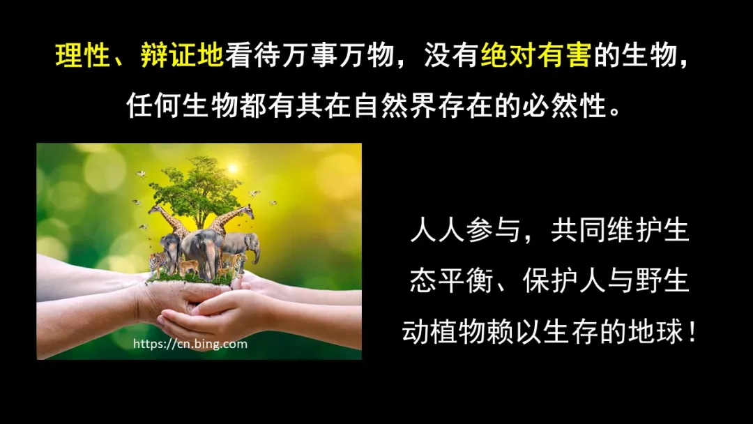 總之,我們應該理性、辯證地看待萬事萬物,沒有絕對有害的生物,任何生物都有其在自然界存在的必然性。