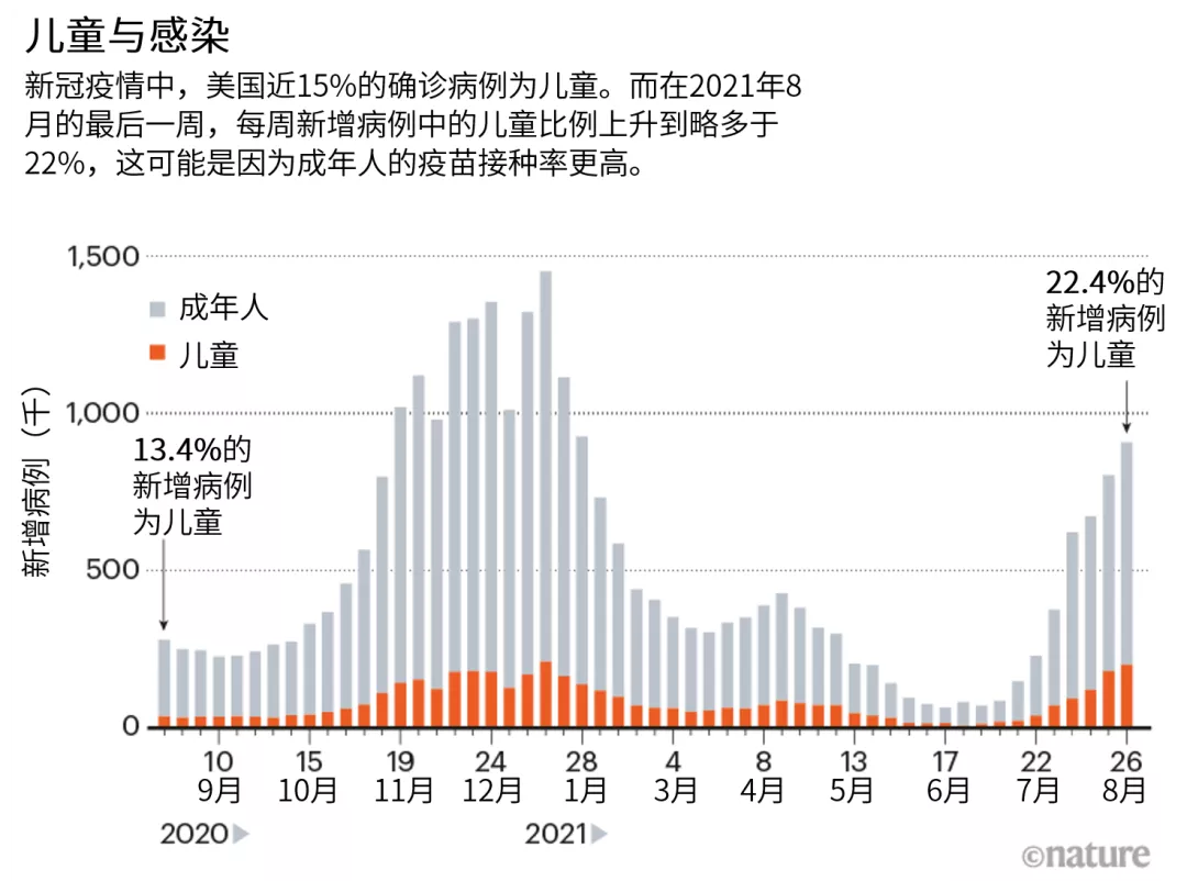 美國兒科學會發現,截至8月底,美國約15%的COVID-19感染者年齡低於21歲——也就是逾480萬人(見“兒童與感染”)。印度一項研究檢測了受試者在感染新冠病毒後或接種疫苗後產生的抗體,結果發現,超半數的6-17歲兒童以及2/3的總人口都有可檢測到的抗體。