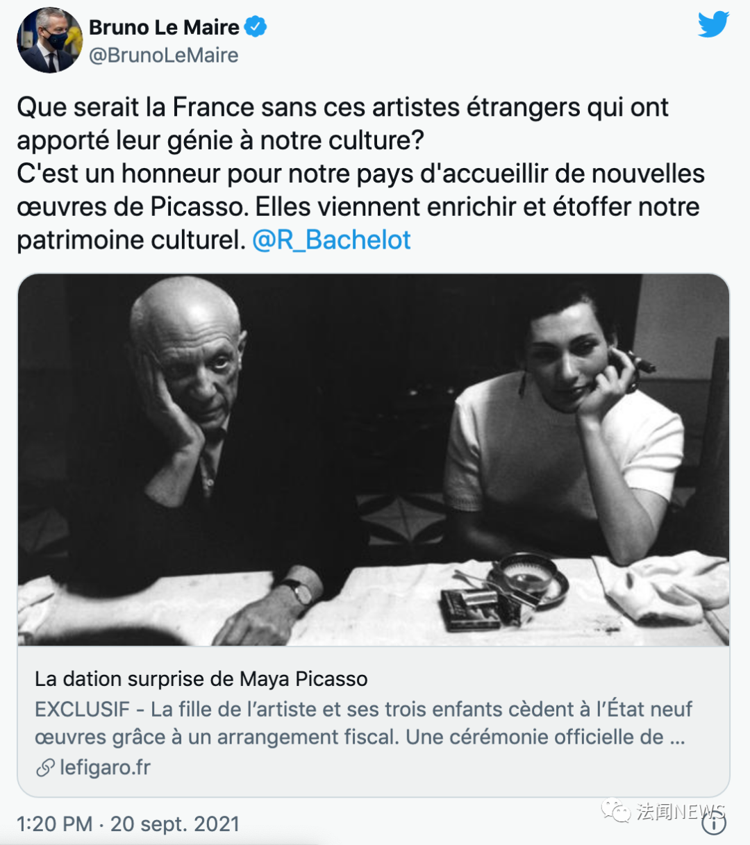 “我們的國家很榮幸能迎來畢加索的新作品。他們豐富和擴大了我們的文化遺產,“經濟部長Bruno Le Maire在其推特賬户上寫道。費加羅報和BFMTV此前曾報道,畢加索的女兒已決定進行捐贈。