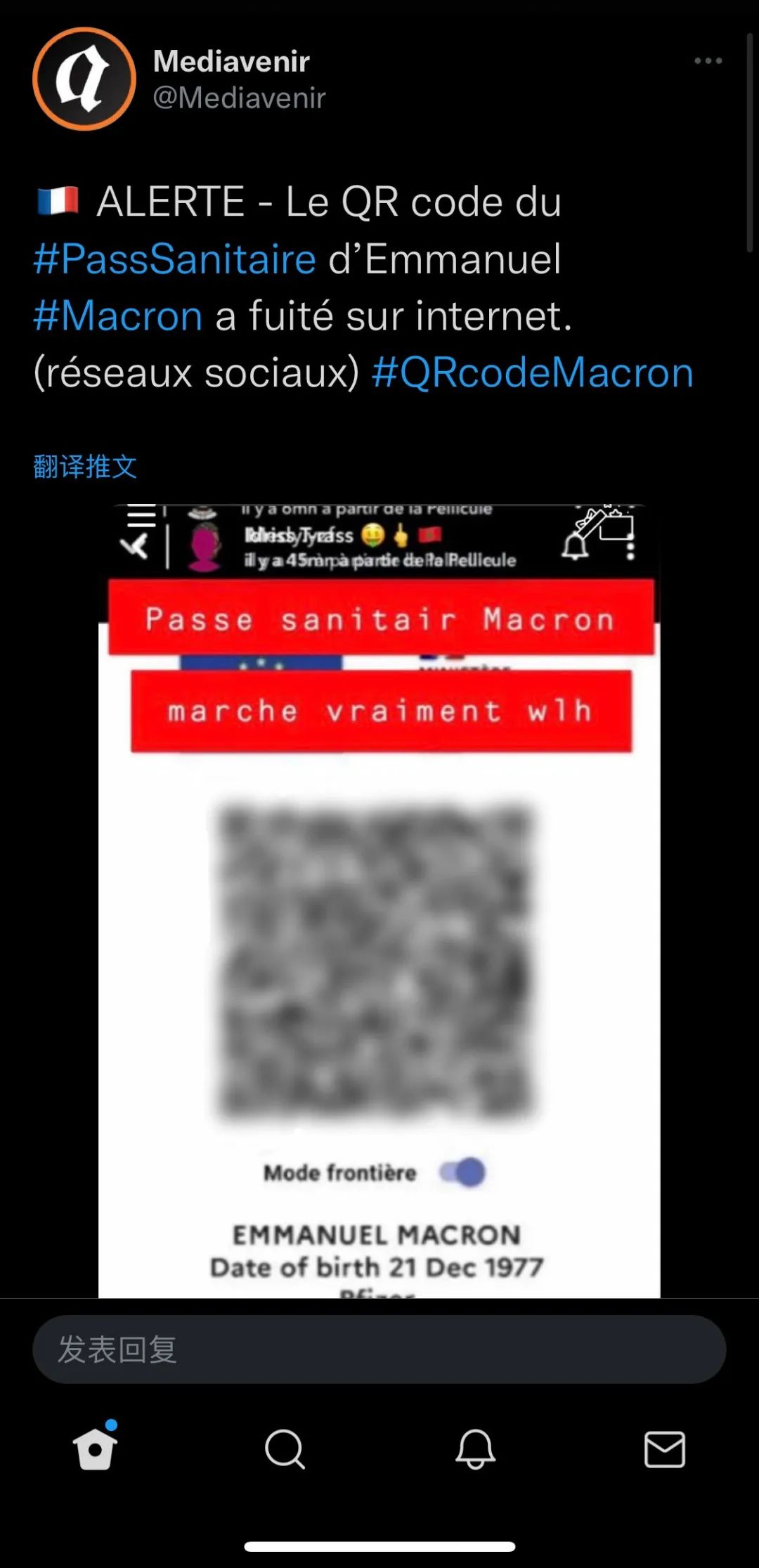 9月21日,法國總統府愛麗捨宮向多家法國媒體證實,法國總統馬克龍的**“健康通行證”二維碼遭到泄露**,並從20日晚間開始在多個社交媒體平台傳播。
