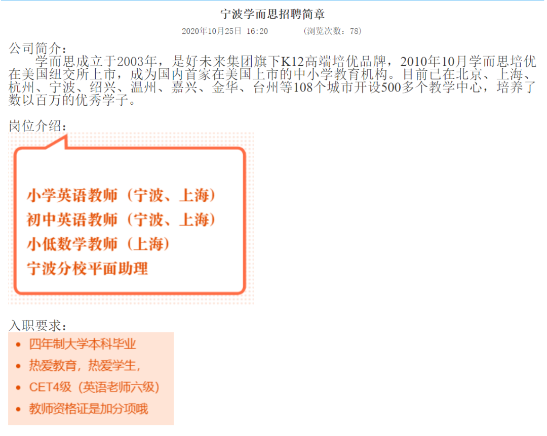 再説師資。很多人覺得學而思的師資好,而學校的師資不行,果真如此麼?為了儘量公平,我們選取了2020年寧波地區學而思和今年寧波市海曙區中小學事業編制的招聘的具體要求,先看學而思的: