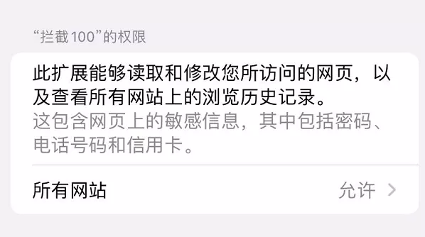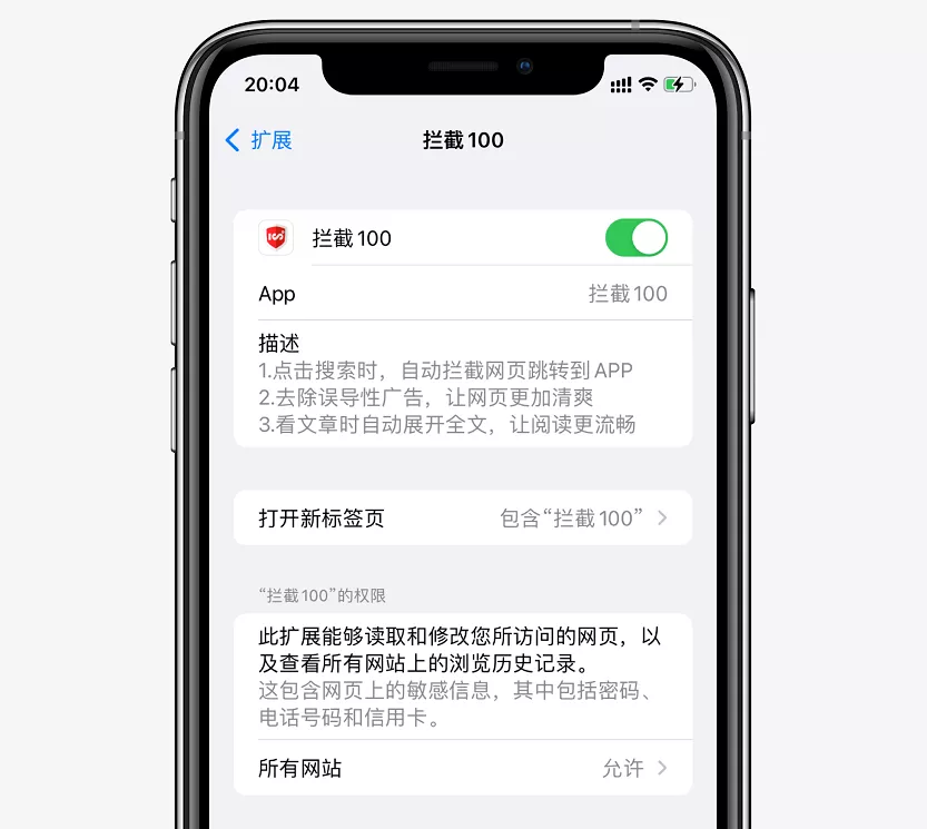軟件使用之前,我們要先進入【 設置 -Safari 瀏覽器 - 擴展 - 攔截 100 】,把裏面的權限打開。