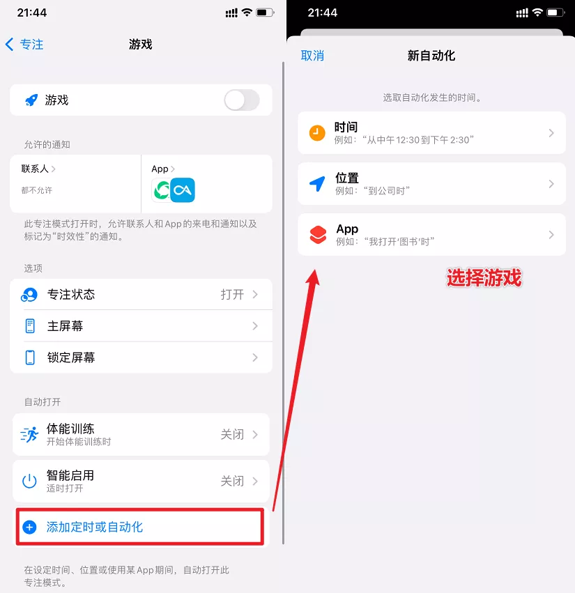 我們依次進入【 設置 - 專注 - 遊戲 - 添加定時或自動化 - App】然後添加遊戲。