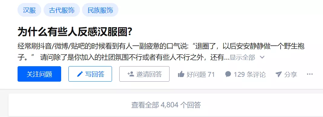 材質不對、細節不對、顏色不對、年代不對、店鋪不對,你可以看到漢服警察埋伏於互聯網的所有角落,熱衷於指摘、拉踩和陰陽怪氣,在知乎搜索“為什麼漢服圈子讓人討厭”可以收穫讓人血壓飆升的漢服警察故事數百則。