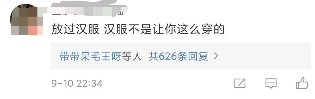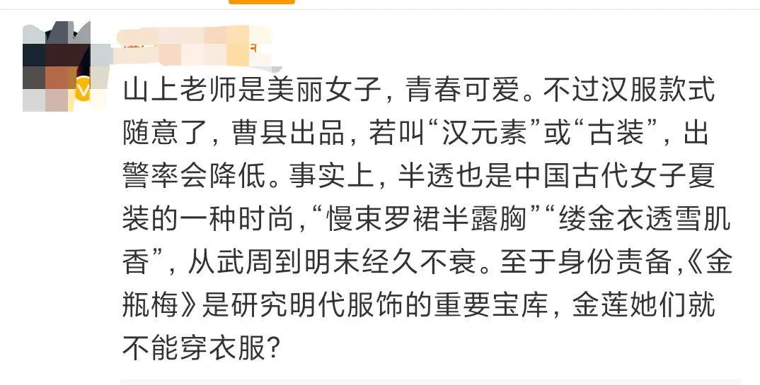 先不提漢服本身就是對古代漢文化體制內,上至皇貴下至走卒的衣服的概稱,三教九流,包括青樓女子在內的衣服的都可以稱作漢服;僅僅是這個發言背後的根深蒂固的等級思想(以社會地位不高的人穿了漢服就是某種僭越)就讓人非常反感。