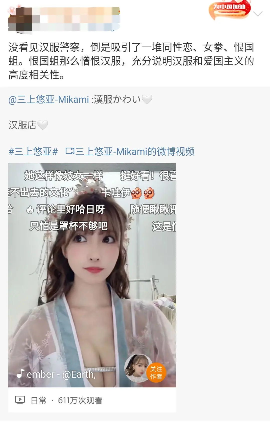 還有上升到攻擊三上悠亞職業低劣穿中國人的衣服就是侮辱中國文化的。