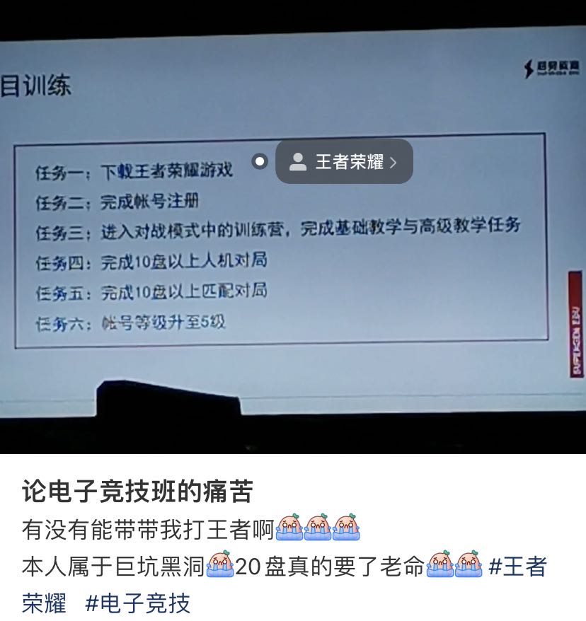 今天刷到一個專業是學電子競技的學會説呢過曬的他們上的課。從他們上課的PPT看,有次訓練的任務是完成王者榮耀的各項初始任務,然後打10盤人機局,10盤匹配局,並把遊戲賬號升至5級。