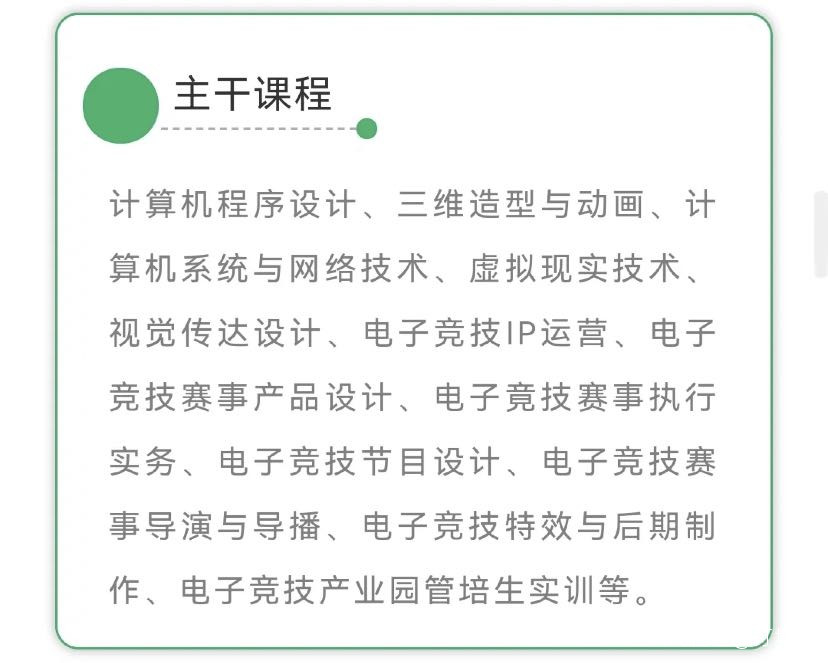 他們的主幹課程,包括:計算機程序設計、三維造型與動畫、計算機系統與網絡技術、虛擬現實技術、視覺傳達設計、電子競技IP運營、電子競技賽事產品設計、電子竟技賽事執行實務、電子競技節目設計、電子競技賽事導演與導播、電子競技特效與後期製作、電子競技產業園管培生實訓等。