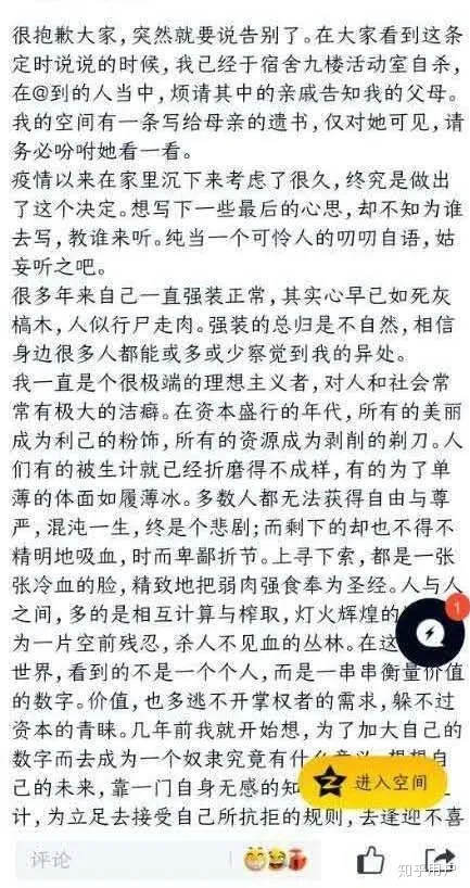之所以會想到這兩件事,是因為這兩位大學生生前都留下過遺書,遺書的內容讀過之後感到很沉重,因此給了我很深的印象。而從他們的遺書中,我們能瞭解到更多關於這個羣體正面臨的焦慮和迷茫。