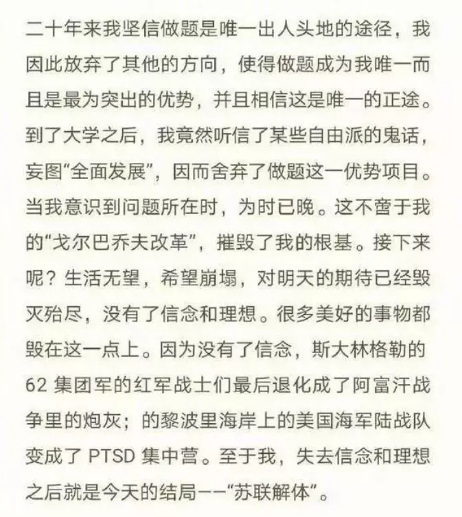 世界是這番景象,也無怪乎這位南航大學生會選擇逃離這個世界。可我們終歸是難以理解會有人因為政治抑鬱而選擇輕生,或許多少也有些個人前途上的失落在其中吧。他之後的北交大學生的遺書無疑就體現了這一點。這位學生在遺書中稱:“二十年來我堅信做題是唯一出人頭地的途徑,我因此放棄了其他的方向,使得做題成為我唯一而且是最為突出的優勢,並且相信這是唯一的正途。到了大學之後,我竟然聽信了某些自由派的鬼話,妄圖“全面發展”,因而捨棄了做題這一優勢項目。當我意識到問題所在時,為時已晚。這不啻於我的“戈爾巴喬夫改革”,摧毀了我的根基。接下來呢?生活無望,希望崩塌,對明天的期待已經毀滅殆盡,沒有了信念和理想。很多美好的事物都毀在這一點上。”他自殺的原因沒有南航大學生那麼複雜,是因為學業績點不夠,無法保研。這個重要上升通道的關閉,意味着他可能畢業的時候就只能以本科生的身份等待着市場的挑選。現在本科生,能有多高的待遇,其實從每年考研人數的攀升就能看出一二。大家都想再提高下學歷,提高下待遇,本科生已經不再是天之驕子了。以法學專業為例,在我們法律界流傳着這樣一個段子,5000元請專職司機,應聘者寥寥,3000元聘個有駕照、通過法考的法學生,簡歷如雪片般飛來。網絡上更是有句話説:我們送走了廉價的農民工,卻迎來了廉價的大學生。