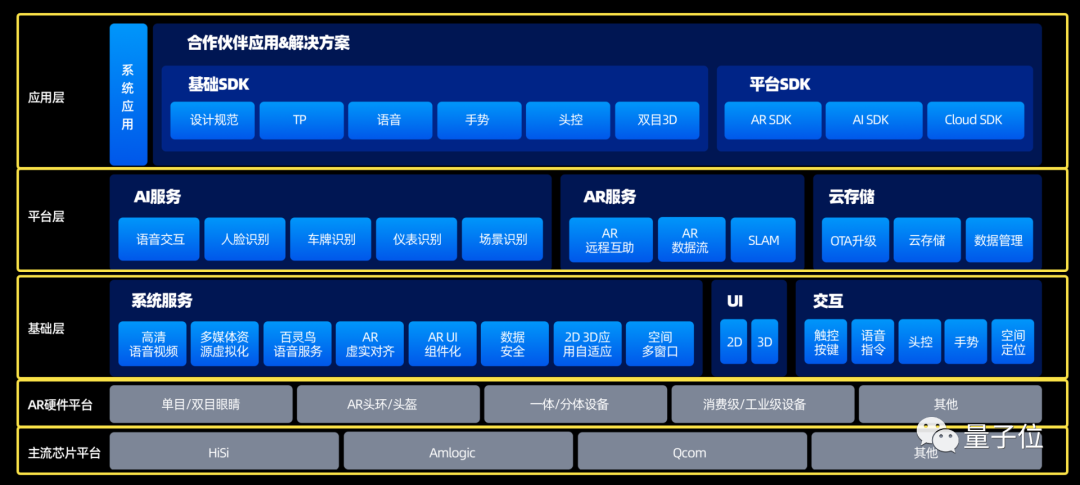 其中,基礎層主要包括AR眼鏡能實現的一些基本系統服務,比如戴上眼鏡就能看到巨幕界面、2D/3D切換、語音交互等等。