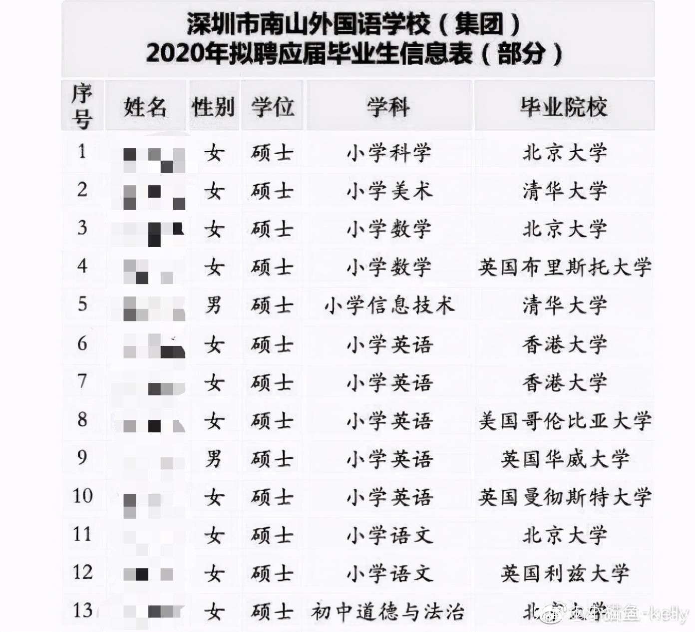 看到一份深圳市南山外國語學校的2020年擬聘應屆畢業生信息表,每一位的畢業院校都是響噹噹的。但我注意到一個問題,擬聘的13位畢業生中僅有兩位男生。