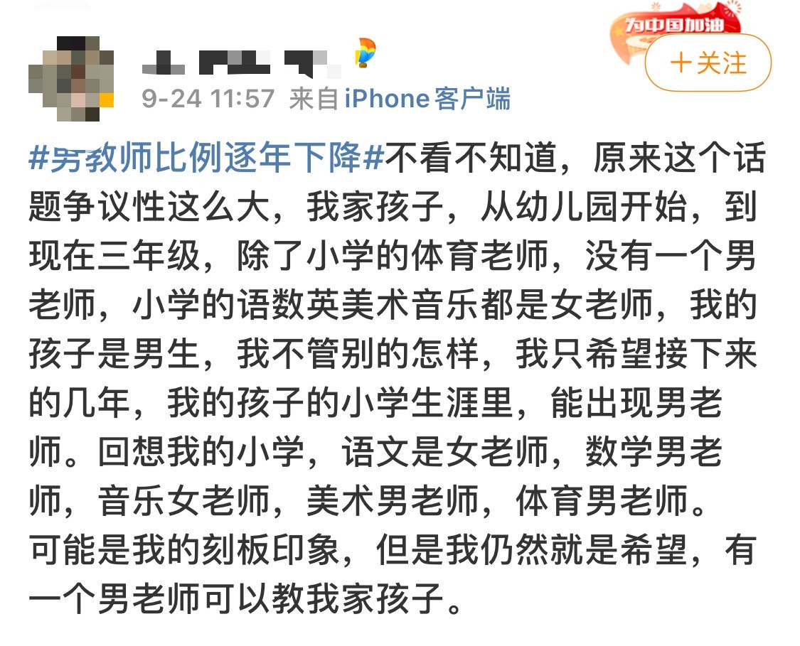 今天光明日報刊登了一篇名為《不應忽視男性教師比例逐年下降問題》的文章,引起了網友們的激烈討論。