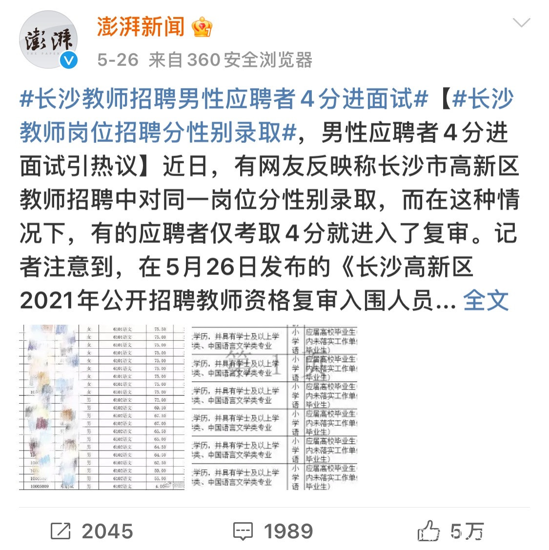 想起今年5月澎湃新聞發過的#長沙教師招聘男性應聘者4分進面試#,是否與數據調查下的現狀有關呢?